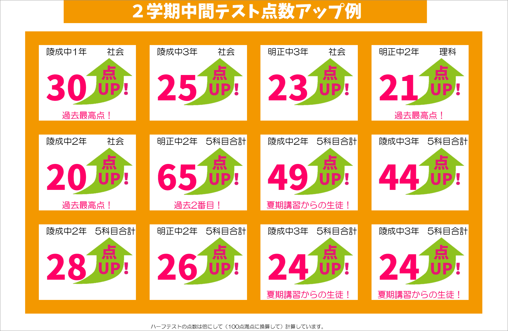 1年生の1学期中間が一番簡単で、ほとんどの子がその時の点数が一番高くなるのですが、その時の点数以上の点数を取ってくれた子もいます。